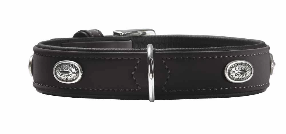 Hunter Halsband Softie Stone Zwart – Hondenhalsband – 65 cm direct bestellen in onze webshop! Kwalitatieve hondenhalsband gemaakt van kunstleer Een goede halsband gaat een hondenleven lang mee. De Halsband Softie Stone van Hunter is een elegante halsband gemaakt van duurzaam kunstleer. Dankzij de medaillonvormige, decoratieve elementen is de Softie Stone een tijdloze en chique halsband. Geproduceerd in Duitsland. Het gebruikte kunstleer maakt de halsband onderhoudsarm waardoor deze ideaal is voor dagelijks gebruik. Ook is de halsband zacht en heeft daardoor een comfortabele pasvorm. De halsband bevat een D-ring waaraan je de riem of rollijn kunt bevestigen. Maattabel Je meet de juiste omtrek met een flexibel meetlint rond het midden van de nek van je hond. Het meetlint moet goed aansluiten, maar moet niet te strak zitten. Zorg ervoor dat er ongeveer een vingerbreedte tussen het meetlint en de nek zit. Kies vervolgens een passende nekomtrek. Valt de omtrek net aan het eind van een maat? Kies dan voor de zekerheid een maatje groter (al helemaal voor honden in de groei). De afmetingen waar je uit kunt kiezen hebben betrekking op de totale bruikbare lengte zonder gesp of andere details. Zie onderstaande tabel voor de kleinste en grootste waarden waarop de halsband versteld kan worden! Maat: Maat: Verstelbare nekomtrek: Breedte halsband: S-M 45 cm 32 – 40 cm 2,8 cm S-M 50 cm 36 – 44 cm 2,8 cm M-L 55 cm 42 – 50 cm 2,8 cm M-L 60 cm 46 – 53 cm 3,5 cm L 65 cm 51 – 58 cm 3,5 cm De Halsband Softie Stone is verkrijgbaar in verschillende kleuren en maten. . Alle Hunter voor uw Hond uit voorraad leverbaar!